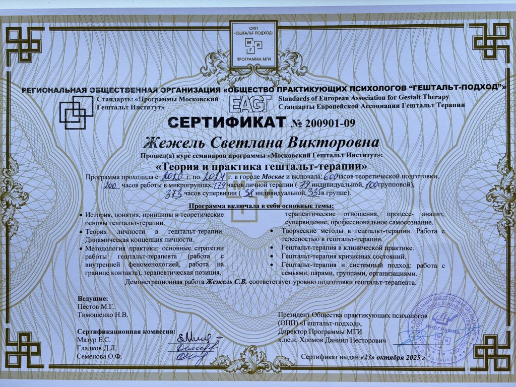 Сертифицированный аккредитованный Гештальт-терапевт ОПП ГП